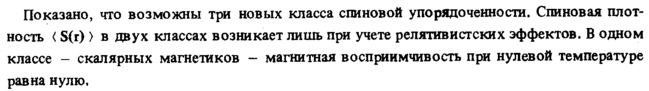 Показано, что возможны три новых класса спиновой упорядоченности. Спиновая плотность < S(r) > в двух классах возникает лишь при учете релятивистских эффектов. В одном классе скалярных магнетиков магнитная восприимчивость при нулевой температуре равна нулю.