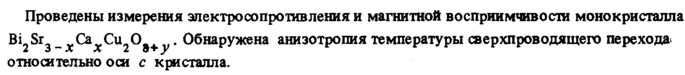 Проведены измерения электросопротивления и магнитной восприимчивости монокристалла BLSr Са Си 0_ „. Обнаружена анизотропия температуры сверхпроводящего перехода' 2 3 ~ Χ X 2 9^ У относительно оси с кристалла.