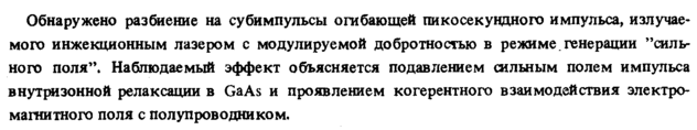 Обнаружено разбиение на субимпульсы огибающей пикосекундного импульса, излучаемого инжекционным лазером с модулируемой добротностью в режиме, генерации "сильного поля". Наблюдаемый эффект объясняется подавлением сильным полем импульса внутризонной релаксации в GaAs и проявлением когерентного взаимодействия электромагнитного поля с полупроводником.