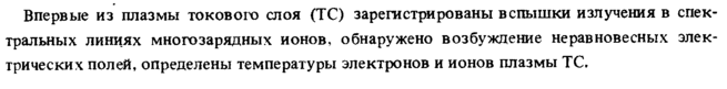 Впервые из плазмы токового слоя (ТС) зарегистрированы вспышки излучения в спектральных линиях многозарядных ионов, обнаружено возбуждение неравновесных электрических полей, определены температуры электронов и ионов плазмы ТС.