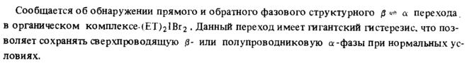 Сообщается об обнаружении прямого и обратного фазового структурного β *± а перехода, в органическом комплексе-(ЕТ)21Вг2 . Данный переход имеет гигантский гистерезис, что позволяет сохранять сверхпроводящую βили полупроводниковую о:-фазы при нормальных условиях.