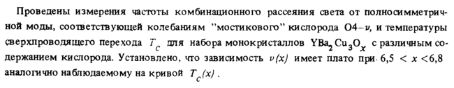 Проведены измерения частоты комбинационного рассеяния света от полно симметричной моды, соответствующей колебаниям "мости ков ого" кислорода 04-v, и температуры сверхпроводящего перехода TQ для набора монокристаллов YBajCiigO^ с различным содержанием кислорода. Установлено, что зависимость v(xj имеет плато при. 6,5 < χ <6,8 аналогично наблюдаемому на кривой Τ (χ) .