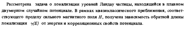 Рассмотрена задача о локализации уровней Ландау частицы, находящейся в плавном двумерном случайном потенциале. В рамках квазиклассического приближения, соответствующего пределу сильного магнитного поля Я, получена зависимость обратной длины локализации у(Е) от энергии и корреляционных свойств потенциала.