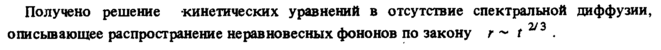 Получено решение -кинетических уравнений в отсутствие спектральной диффузии, описывающее распространение неравновесных фононов по закону г — г 2/3 .
