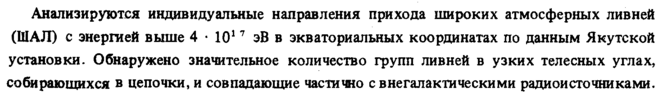 Анализируются индивидуальные направления прихода широких атмосферных ливней (ШАЛ) с энергией выше 4 · 1017 эВ в экваториальных координатах по данным Якутской установки. Обнаружено значительное количество групп ливней в узких телесных углах, собирающихся в цепочки, и совпадающие частично с внегалактическими радиоисточниками.