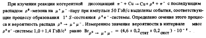При изучении реакции когерентной диссоциации π" + Си Си+ р° + я" с последующим распадом р9 -мезона на μ + μ" -пару при импульсе 50 ГэВ/с выделены события, соответствующие процессу образования 1+ S-состояния p°tr~ -системы. Определено сечение этого процесса и вероятность распада р° μ + μ'. Измеренное значение вероятности в интервале масс р°тГ -системы 1,0-М,4 ГэВ/с2 равно Вгр0 _ μ+μ= (4>6 * °>2стат * 0,2сист * ' 10~' *