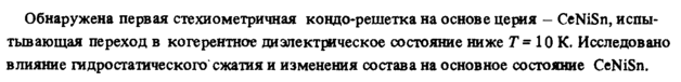 Обнаружена первая стехиометричная кондо-решетка на основе церия CeNiSn, испы-тывающая переход в когерентное диэлектрическое состояние ниже Т= 10 К, Исследовано влияние гидростатического сжатия и изменения состава на основное состояние CeNiSn.