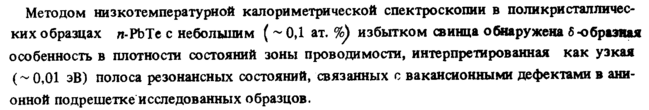 Методом низкотемпературной калориметрической спектроскопии в поликристаллических образцах л-РЬТе с небольшим ( ~ ОД ат. %) избытком свинца обнаружена δ -образная особенность в плотности состояний зоны проводимости, интерпретированная как узкая (^ 0,01 эВ) полоса резонансных состояний, связанных с вакансионными дефектами в анионной подрешетке исследованных образцов.