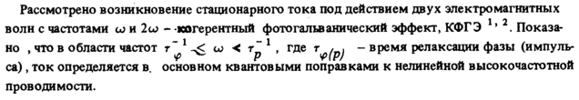 Рассмотрено возникновение стационарного тока под действием двух электромагнитных волн с частотами ωπ2ωкогерентный фотогальванический эффект, КФГЭ *' 2. Показано , что в области частот г^1 ω < т~ 1 , где T^fpj время релаксации фазы (импульса) , ток определяется в. основном квантовыми поправками к нелинейной высокочастотной проводимости.