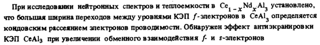 При исследовании нейтронных спектров и теплоемкости в Cq1 _ ^Nd -АЦ установлено, что большая ширина переходов между уровнями КЭП /-электронов в СеАЦ определяется кондовским рассеянием электронов проводимости. Обнаружен эффект антиэкранировки КЭП СеА1з при увеличении обменного взаимодействия /и s-электронов