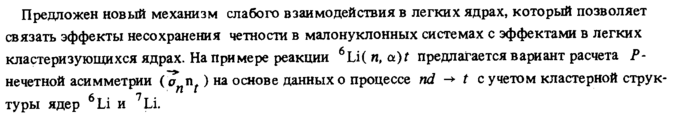 Предложен новый механизм слабого взаимодействия в легких ядрах, который позволяет связать эффекты несохранения четности в малонуклонных системах с эффектами в легких кластеризующихся ядрах. На примере реакции 6Li( п, a)t предлагается вариант расчета Р-нечетной асимметрии (<Г η ) на основе данных о процессе nd -* t с учетом кластерной струк6 7 туры ядер Li и Li.