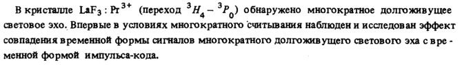 В кристалле LaF3:Pr3+ (переход 3#4~ 3PQ) обнаружено многократное долгоживущее световое эхо. Впервые в условиях многократного считывания наблюден и исследован эффект совпадения временной формы сигналов многократного до л го живущего светового эха свре -менной формой импульса-кода.