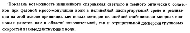 Показана возможность нелинейного спаривания светлого и темного оптических еолито-нов при фазовой кросс-модуляции волн в нелинейной диспергирующей среде и реализации на этой основе принципиалыг) новых методов нелинейной стабилизации мощных волновых пакетов как в области' положительной, так и отрицательной дисперсии групповых скоростей взаимодействующих волн.