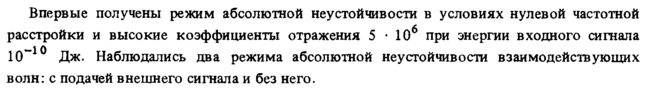 Впервые получены режим абсолютной неустойчивости в условиях нулевой частотной расстройки и высокие коэффициенты отражения 5 · 106 при энергии входного сигнала 10~10 Дж. Наблюдались два режима абсолютной неустойчивости взаимодействующих волн: с подачей внешнего сигнала и без него.