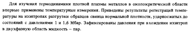 Для изучения термодинамики плотной плазмы металлов в околокритической области впервые применены температурные измерения. Приведены результаты регистраций температуры на изэнтропах разгрузки образцов свинца нормальной плотности, ударносжатых до состояний с давлениями 1 и 1,6 Мбар. Зафиксированы давления при вхождении изэнтроп в двухфазную область жидкость пар.