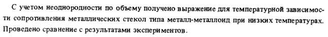 С учетом неоднородности по объему получено выражение для температурной зависимости сопротивления металлических стекол типа металл-металлоид при низких температурах. Проведено сравнение с результатами экспериментов.