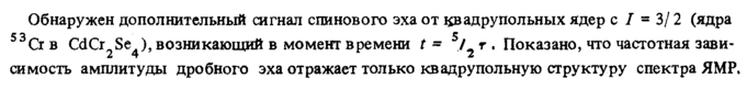 Обнаружен дополнительный сигнал спинового эха от квадрупольных ядер с I = 3/ 2 (ядра 53Сг в CdCr2Se4), возникающий в момент времени t = 5/2 г , Показано, что частотная зависимость амплитуды дробного эха отражает только квадрупольную структуру спектра ЯМР,