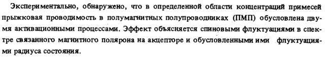 Экспериментально, обнаружено, что в определенной области концентраций примесей прыжковая проводимость в по л у магнитных полупроводниках (ПМП) обусловлена двумя активационными процессами. Эффект объясняется спиновыми флуктуациями в спектре связанного магнитного полярона на акцепторе и обусловленными ими флуктуациями радиуса состояния.