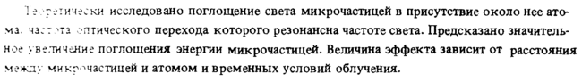 Теоретически исследовано поглощение света микрочастицей в присутствие около нее атома, част ота оптического перехода которого резонансна частоте света. Предсказано значительное увеличение поглощения энергии микрочастицей. Величина эффекта зависит от расстояния между микрочастицей и атомом и временных условий облучения.