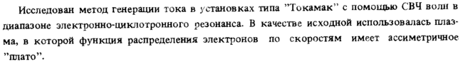 Исследован метод генерации тока в установках типа "Токамак" с помощью СВЧ волн в диапазоне электронно-циклотронного резонанса. В качестве исходной использовалась плаз* ма, в которой функция распределения электронов по скоростям имеет ассиметричное "плато".