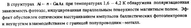 В структурах М-пGaAs при температурах 1,6 4,2 К обнаружена поляризационная зависимость фотоэдс, индуцированная параллельным поверхности магнитным полем. Эффект обусловлен оптическим выстраиванием импульсов баллистических фотоэлектронов и неупругим взаимодействием с границей полупроводник-металл.