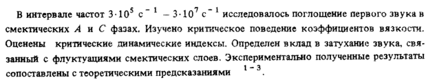 В интервале частот 3 10s с " 1 3■ 107 с* 1 исследовалось поглощение первого звука в смектических А и С фазах. Изучено критическое поведение коэффициентов вязкости. Оценены критические динамические индексы. Определен вклад в затухание звука, связанный с флуктуациями смектических слоев. Экспериментально полученные результаты ι з сопоставлены с теоретическими предсказаниями