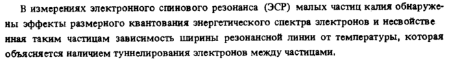 В измерениях электронного спинового резонанса (ЭСР) малых частиц калия обнаружены эффекты размерного квантования энергетического спектра электронов и несвойстве иная таким частицам зависимость ширины резонансной линии от температуры, которая объясняется наличием туннелирования электронов между частицами.
