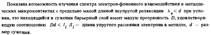 Показана возможность изучения спектра электрон-фононного взаимодействия в металлических микро контактах с предельно малой длиной неупругой релаксации \f< d при условии, что находящийся в сужении барьерный слой имеет малую прозрачность Z), удовлетворяющую соотношению Dd < I. β. — длина упругого рассеяния электрона в металле, d размер сужения.