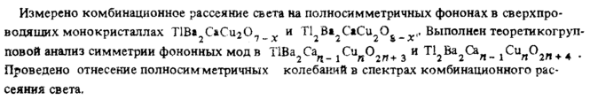 Измерено комбинационное рассеяние света на полносимметричных фононахв сверхпроводящих монокристаллах TlBaCaCu^O. v и Т1В*лСаСи О , Выполнен теоретикогрупповой анализ симметрии фононных мод в Т1Ва2Са^_ i^ffl^n* з и Τ*2^2^η 1^ип®2П + 4 · Проведено отнесение полносим метричных колебаний в спектрах комбинационного рассеяния света.