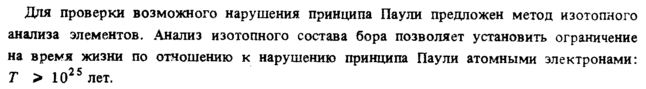 Для проверки возможного нарушения принципа Паули предложен метод изотопного анализа элементов. Анализ изотопного состава бора позволяет установить ограничение на время жизни по отношению к нарушению принципа Паули атомными электронами: Τ > 1025 лет.