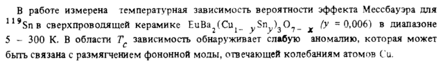 В работе измерена температурная зависимость вероятности эффекта Мессбауэра для 119SnB сверхпроводящей керамике EuBa^Cu^ γ^ηγ\°Ίх (У ~ 0,006) в диапазоне 5 300 К. В области Τ зависимость обнаруживает слабую аномалию, которая может быть связана с размягчением фононной моды, отвечающей колебаниям атомов Си,