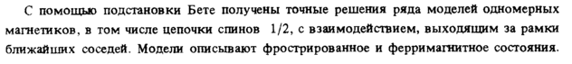 С помощью подстановки Бете получены точные решения ряда моделей одномерных магнетиков, в том числе цепочки спинов 1/2, с взаимодействием, выходящим за рамки ближайших соседей. Модели описывают фрострированное и ферримагнитное состояния.