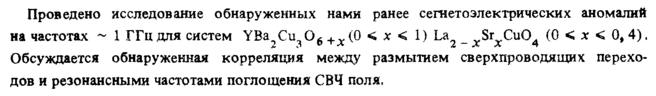 Проведено исследование обнаруженных нами ранее сегнетоэлектрических аномалий на частотах ~ i ГГц для систем YBa,Cu306 +χ(0 < χ < 1) La^ _ ^.Sr^CiK^ (0 < χ < 0, 4). Обсуждается обнаруженная корреляция между размытием сверхпроводящих переходов и резонансными частотами поглощения СВЧ поля,