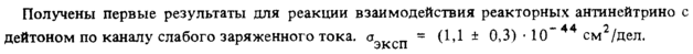 Получены первые результаты для реакции взаимодействия реакторных антинейтрино с Дейтоном по каналу слабого заряженного тока, σ г (1,1 ± 0,3) · 10 см /дел.