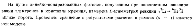 На пучке линейно-поляризованных фотонов, полученном при плоскостном каналиро-вании электронов в кристалле кремния, измерена Σ-асимметрия реакции -y7Li-+ tie^H вблизи порога. Проведено сравнение с результатами расчетов в рамках (а — г)-кластерной модели.