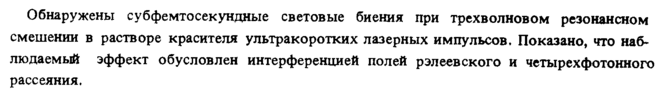 Обнаружены субфемтосекундные световые биения при трехволновом резонансном смешении в растворе красителя ультракоротких лазерных импульсов. Показано, что наблюдаемый эффект обусловлен интерференцией полей рэлеевского и четырехфотонного рассеяния.