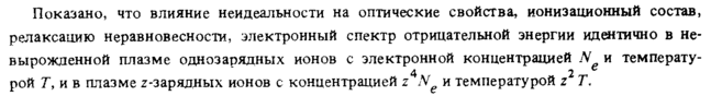 Показано, что влияние неидеальности на оптические свойства, ионизационный состав, релаксацию неравновесности, электронный спектр отрицательной энергии идентично в невырожденной плазме однозарядных ионов с электронной концентрацией N и температу4 2 ^ рой Т, и в плазме z-зарядных ионов с концентрацией ζ Nе и температурой ζ Т.