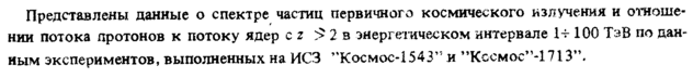 Представлены данные о спектре частиц первичного космического излучения и отношении потока протонов к потоку ядер с ζ :> 2 в энерг етическом интервале 1-f 100 ТэВ по данным экспериментов, выполненных на ИСЗ "Космос-1543" и "Космос"-! 713".