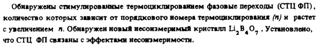 Обнаружены стимулированные термоцнклированием фазовые переходы (СТЦ ФП), количество которых зависит от порядкового номера терм оцнкли ров ания (п) и растет с увеличением п, Обнаружен новый несоизмеримый кристалл Li2B40? , Установлено, что СТЦ ФП связаны с эффектами несоизмеримости.