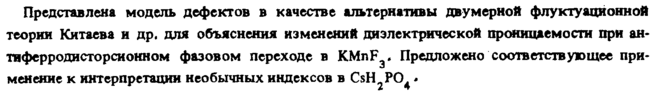 Представлена модель дефектов в качестве альтернативы двумерной флуктуанионной теории Китаева и др, для объяснения изменений диэлектрической проницаемости при ан-тиферродисторсионном фазовом переходе в KMnF . Предложено соответствующее при-менекие к интерпретации необычных индексов в CsH РО *