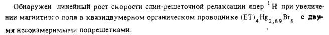 Обнаружен линейный рост скорости спин-решеточной релаксации ядер Η при увеличении магнитного поля в квазидвумерном органическом проводнике (ET).Hg. 0ПВгс с дв)к 4 2,89 8 мя несоизмеримыми подрешетками.