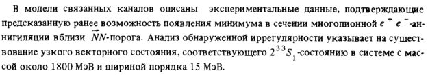 В модели связанных каналов описаны экспериментальные данные, подтверждающие предсказанную ранее возможность появления минимума в сечении многопионной е + е "-аннигиляции вблизи AW-порога. Анализ обнаруженной иррегулярности указывает на существование узкого векторного состояния, соответствующего 233Sl-состоянию в системе с массой около 1800 МэВ и шириной порядка 15 МэВ.