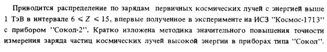 Приводится распределение по зарядам первичных космических лучей с энергией выше 1 ТэВ в интервале 6 < Ζ < 15, впервые полученное в эксперименте на ИСЗ "Космос-1713" с прибором "Сокол-2", Кратко изложена методика значительного повышения точности измерения заряда частиц космических лучей высокой энергии в приборах типа "Сокол".