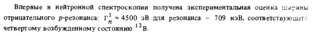 Впервые в нейтронной спектроскопии отрицательного р-резонанса: Г1 « 4500 эВ четвертому возбужденному состоянию В. получена экспериментальная оценка ширины для резонанса 709 кэВ, соответствующего