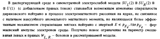 В диспергирующей среде в симметричной электрослабой модели SU^(2) Si SU^(2) 81 ® U(I) (с добавлением правых токов) становится возможным изменение спиральности дираковского нейтрино в процессе электромагнитного рассеяния на ядрах, не связанное с наличием вакуумного аномального магнитного момента, но являющееся более эффективным механизмом стерилизации мягких нейтрино с энергией Ε < рр , гдер^ фер-миевский импульс электронов среды. Получено новое ограничение на параметр смешивания левых и правых W, R — бозонов в рассматриваемой модели.