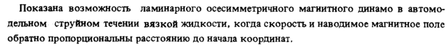 Показана возможность ламинарного осесимметричного магнитного динамо в автомодельном струйном течении вязкой жидкости, когда скорость и наводимое магнитное поле обратно пропорциональны расстоянию до начала координат.