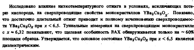 Исследовано влияние низкотемпературного отжига в условиях, исключающих потерю кислорода, на сверхпроводящие свойства монокристаллов УВазСизО^. Показано, что достаточно длительный отжиг приводит к полному исчезновению сверхпроводимости YBa2Cu3Ox при χ < 6,5. Туннельные измерения на сверхпроводящем монокристалле с χ * 6,32 показывают, что щелевая особенность ΒΑΧ обнаруживается только на ~ 60% площади образцаУтверждается, что основное состояние YBa2Cu3Ox при χ < 6,5 является диэлектрическим.