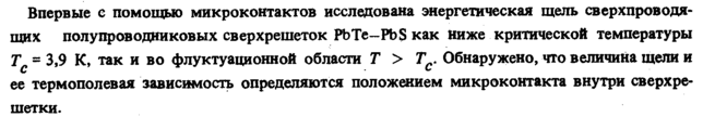 Впервые с помощью микроконтактов исследована энергетическая щель сверхпроводящих полупроводниковых сверхрешеток PbTe-PbS как ниже критической температуры Тс 3,9 К, так и во флуктуационной области Τ > TQ. Обнаружено, что величина щели и ее термополевая зависимость определяются положением микроконтакта внутри сверхрешетки.