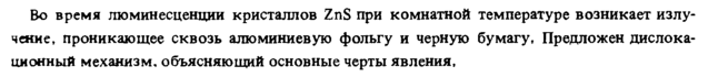 Во время люминесценции кристаллов ZnS при комнатной температуре возникает излучение, проникающее сквозь алюминиевую фольгу и черную бумагу, Предложен дислокационный механизм, объясняющий основные черты явления,