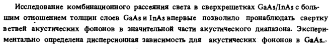 Исследование комбинационного рассеяния света в сверхрешетках GaAs/InAs с большим отношением толщин слоев GaAs и InAs впервые позволило пронаблюдать свертку ветвей акустических фононов в значительной части акустического диапазона. Экспериментально определена дисперсионная зависимость для акустических фононов в GaAs.,